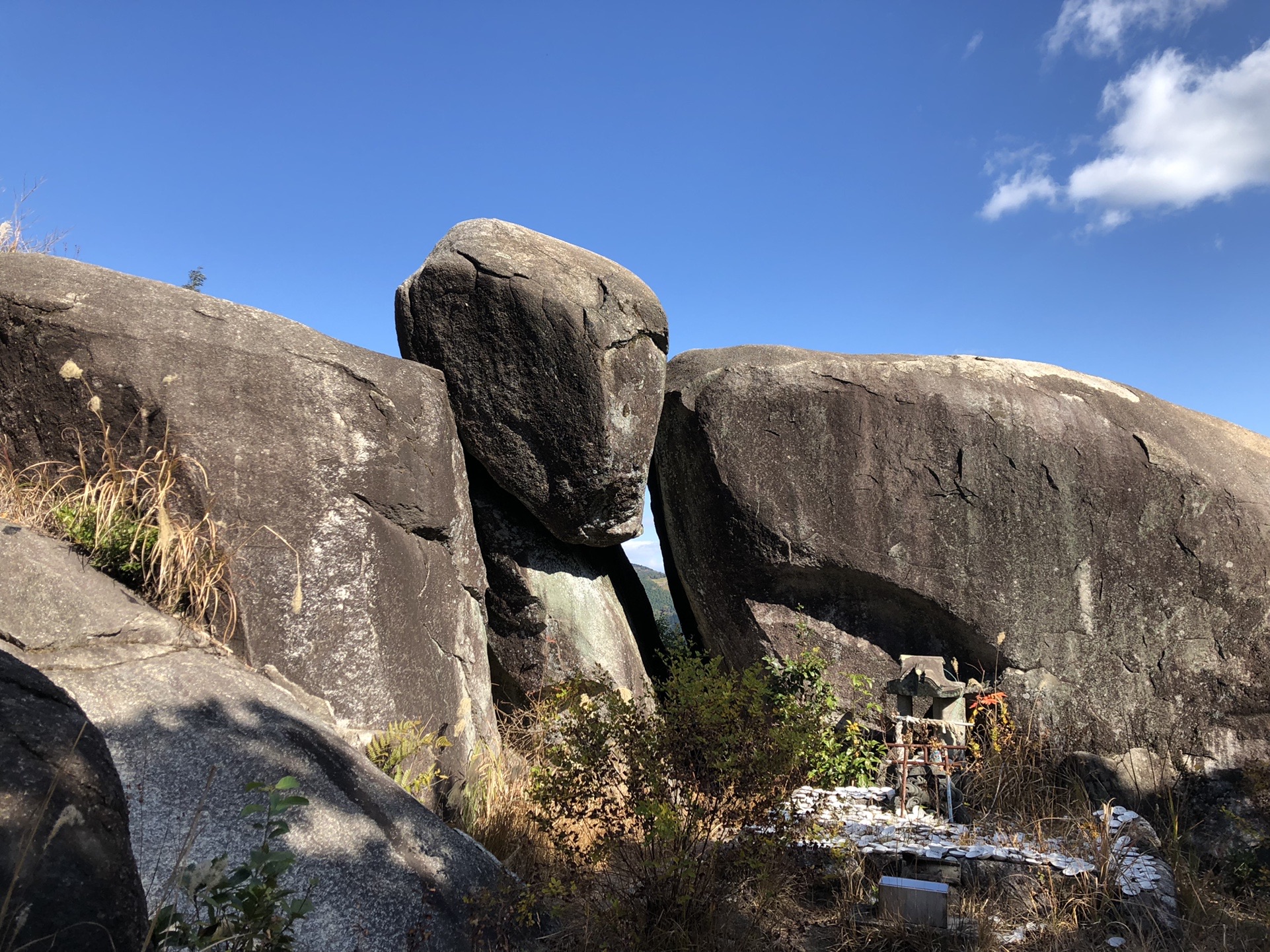 僕は、この巨岩自体が御神体ということも知らず、展望が良さそうなので登ってはしゃいでしまった。しかし、巨岩には登った跡があるので、みんな登っているようだ。